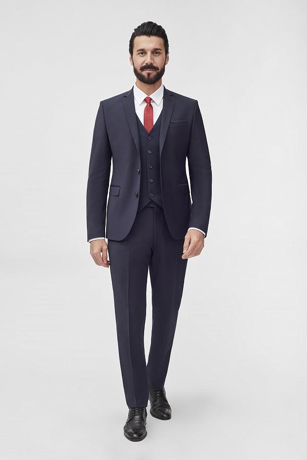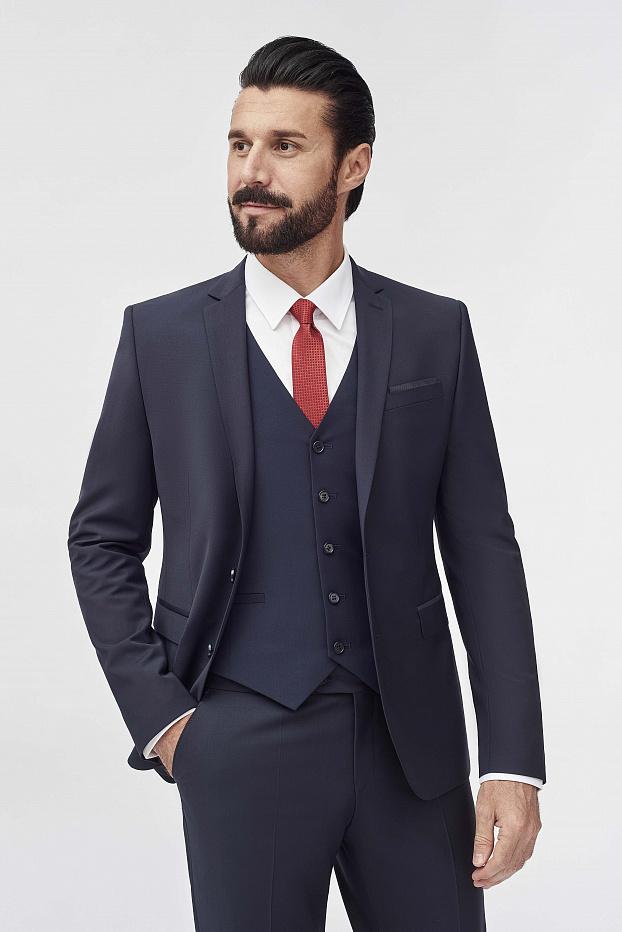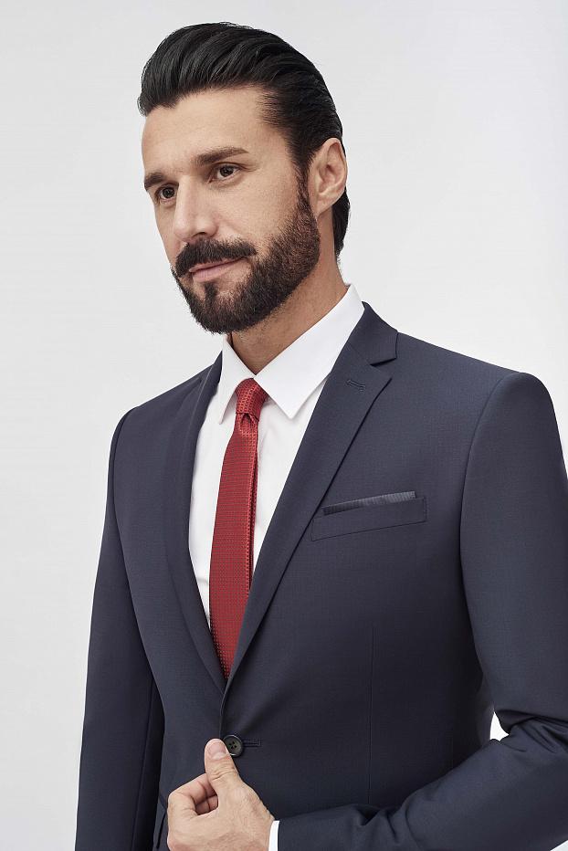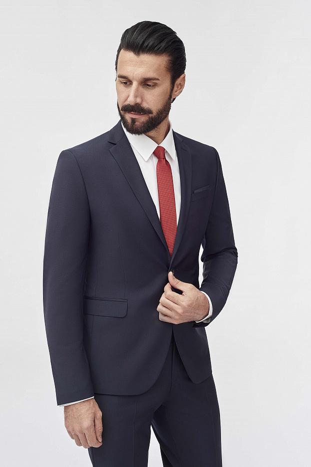 Элегантный тёмно-синий костюм из премиальной шерсти с добавлением лайкры — идеальное решение для любого случая: от деловых переговоров до торжественных событий.