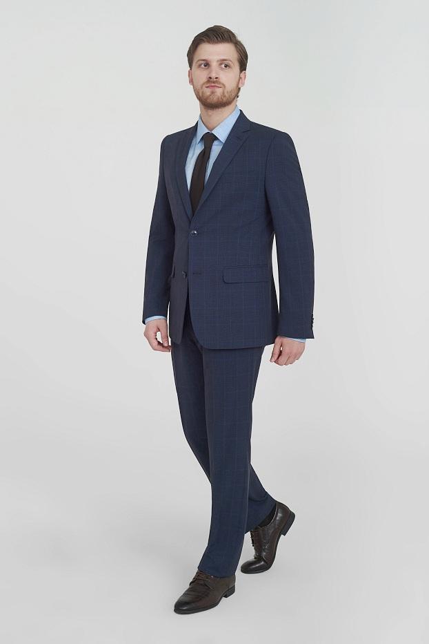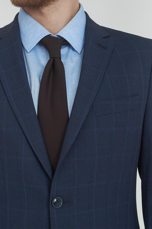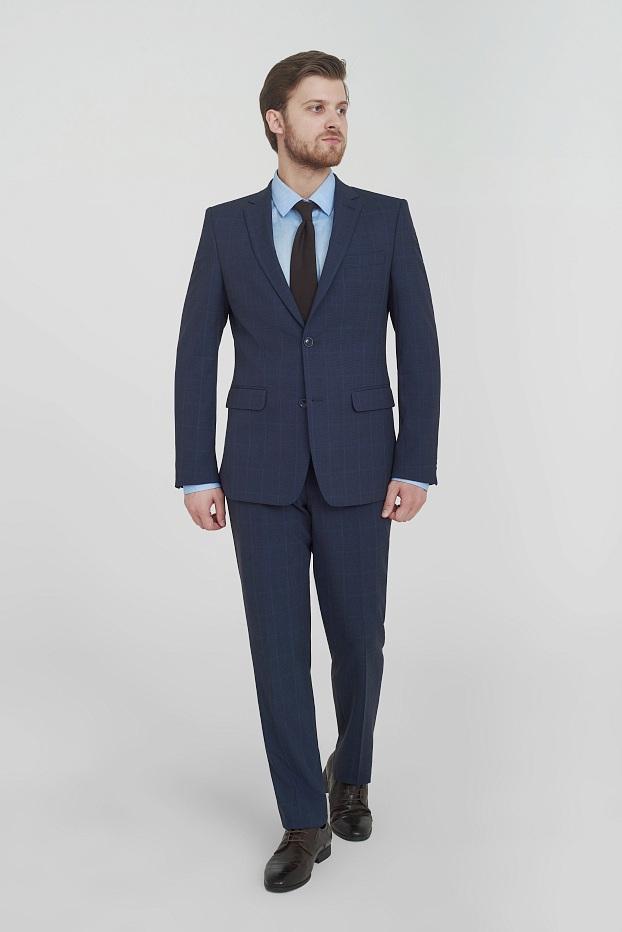 Деловой костюм в благородной синей палитре с утончённой клетчатой текстурой создаёт образ современного джентльмена с классическим вкусом.
