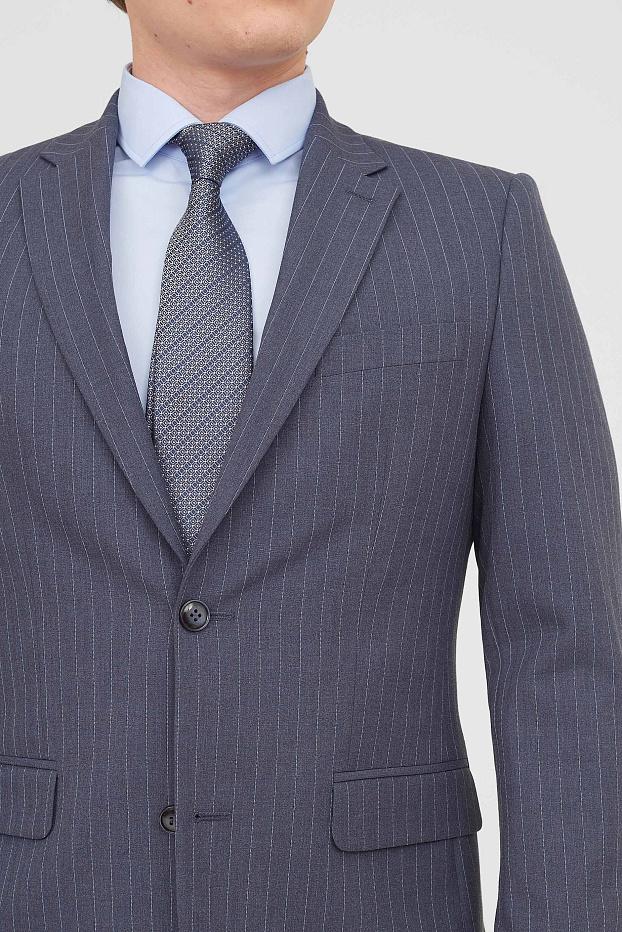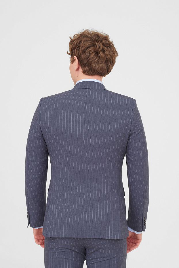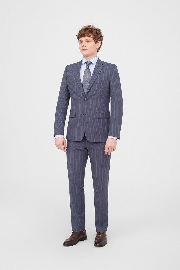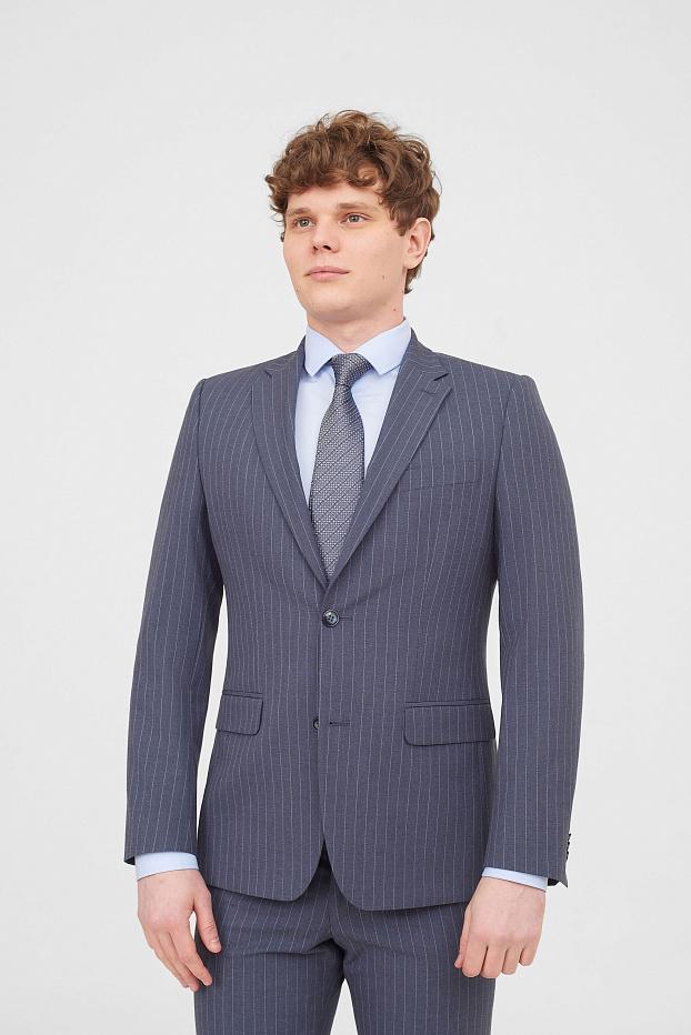 Элегантный деловой костюм серо синего цвета в тонкую полоску — идеальный выбор для торжественных событий. Подойдёт жениху на свадьбу или выпускнику на бал. Строгий крой подчёркивает силуэт, создавая безупречный образ.